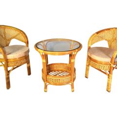Комплект мебели Пеланги 02/15 включает в себя: 2 кресла и столик с красивым плетением снизу и полочкой, съемные подушки из материала улучшенного качества.